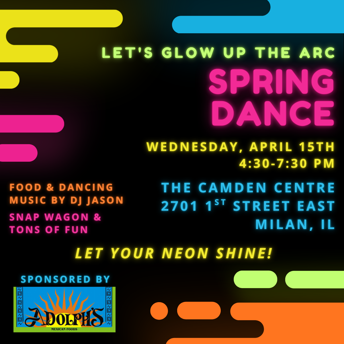 Join The Arc of The Quad Cities Area for our Spring Dance and dance the night away at The Camden Centre! Glow up The Arc and let your neon shine under the blacklights. Music provided by DJ Jason and food will be provided by the sponsor Adolph’s Mexican Food.